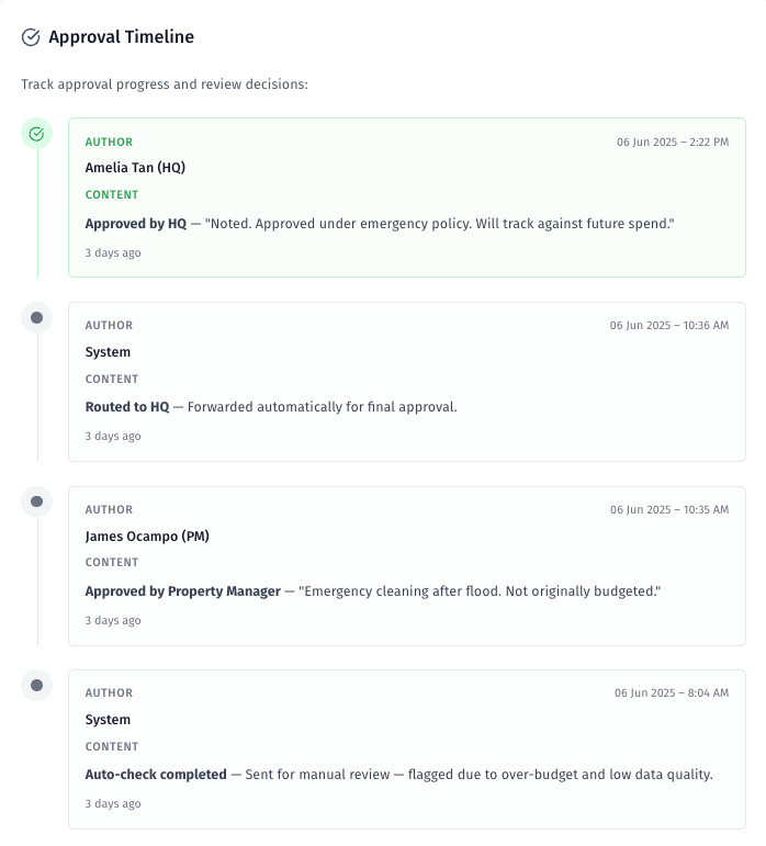 The decision (approve or reject) is recorded in the approval timeline, visible to all collaborators.